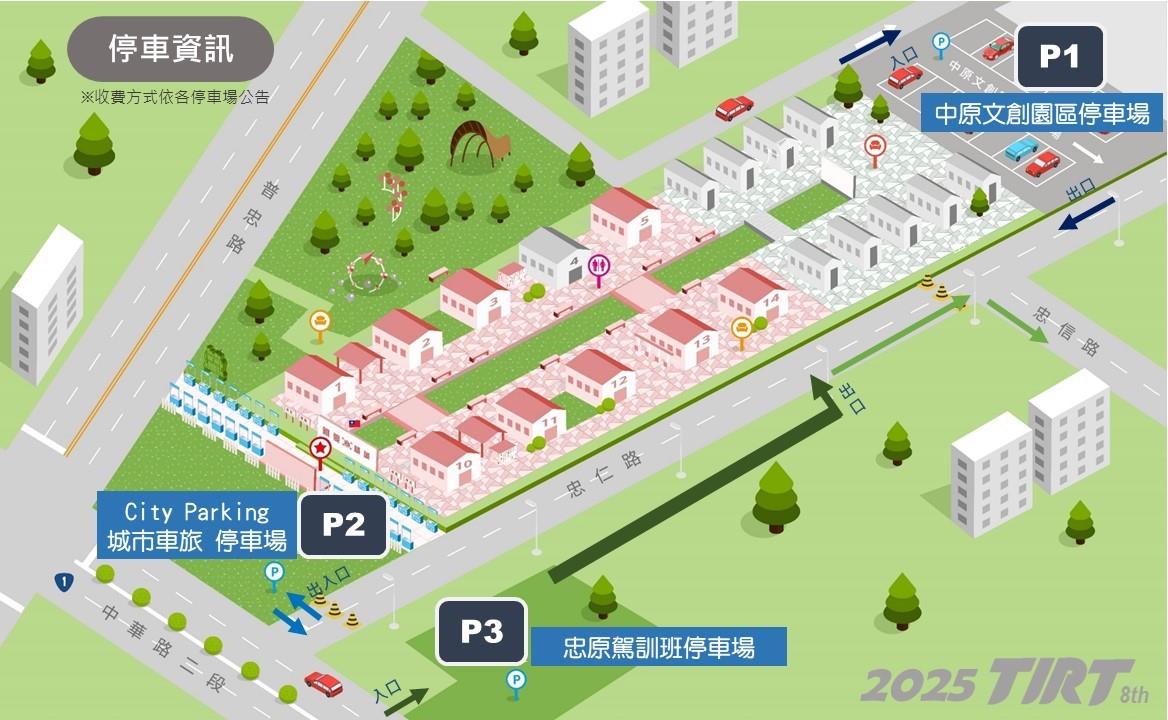 2025/10/20 【2025 TIRT國際賽-中原文創園區 交通資訊及停車場位置】 停車場: P1中原文創園區停車場(普忠路 - 忠信路268巷 ) P2 City Parking 城市車旅 停車場(中華路二段 - 忠仁路) P3 忠原駕訓班 停車場 (桃園市中壢區中華路二段167號)