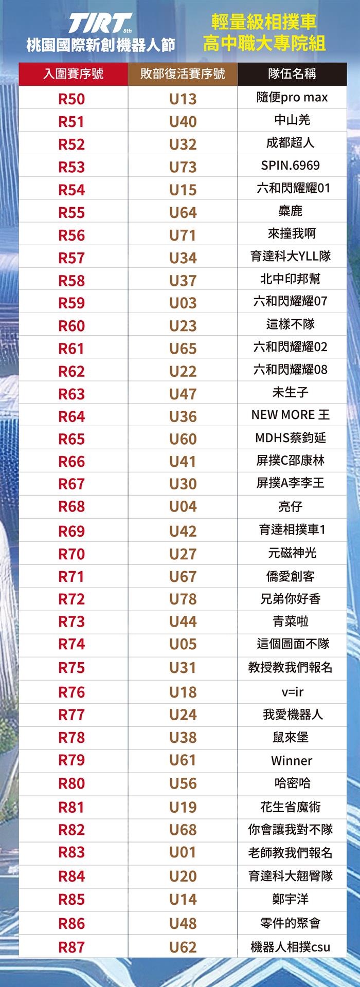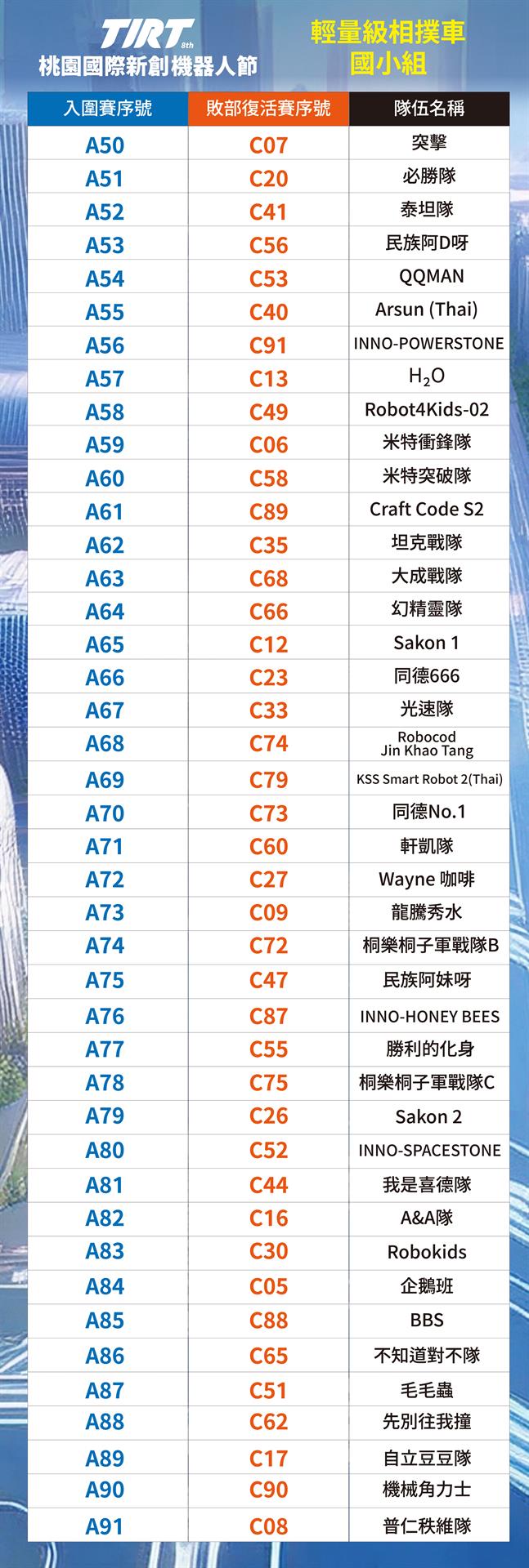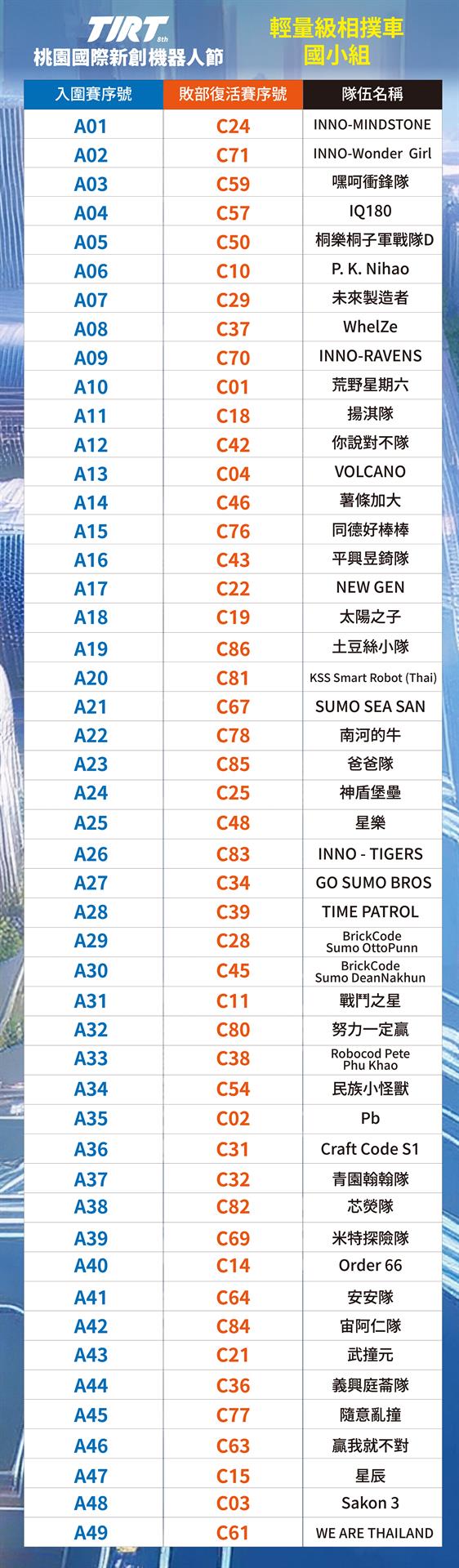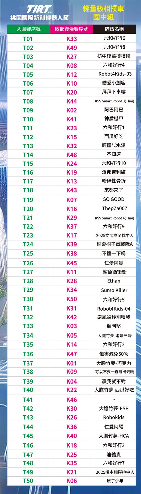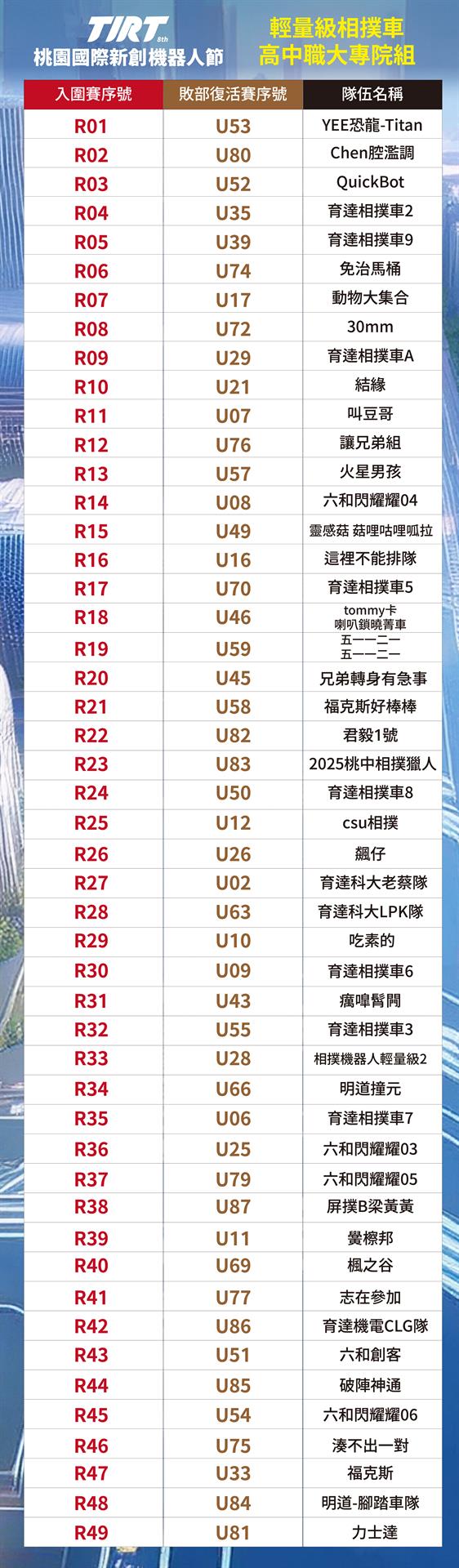 📣2025 TIRT國際賽-桃園中原文創園區CYCC 相撲機器人輕量級_抽籤順序_公告